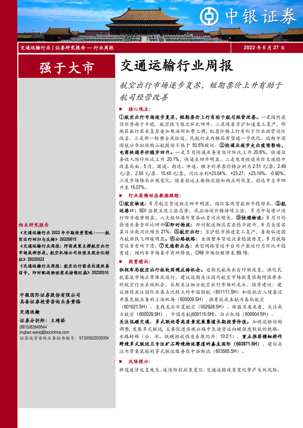 【中银证券】【20220627】交通运输行业周报:航空出行市场逐步复苏,短期票价上升有助于航司经营改善-25页
