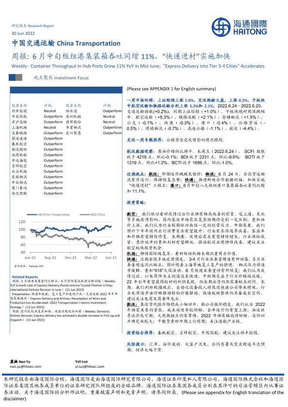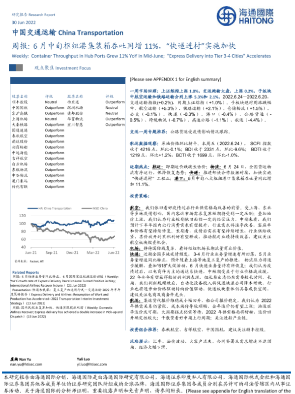 【海通国际】【20220630】中国交通运输周报:6月中旬枢纽港集装箱吞吐同增11%,“快递进村”实施加快-15页
