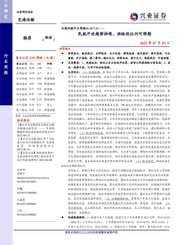 【兴业证券】【20220703】交通运输行业周报:民航开放趋势持续,供给低位仍可预期-40页