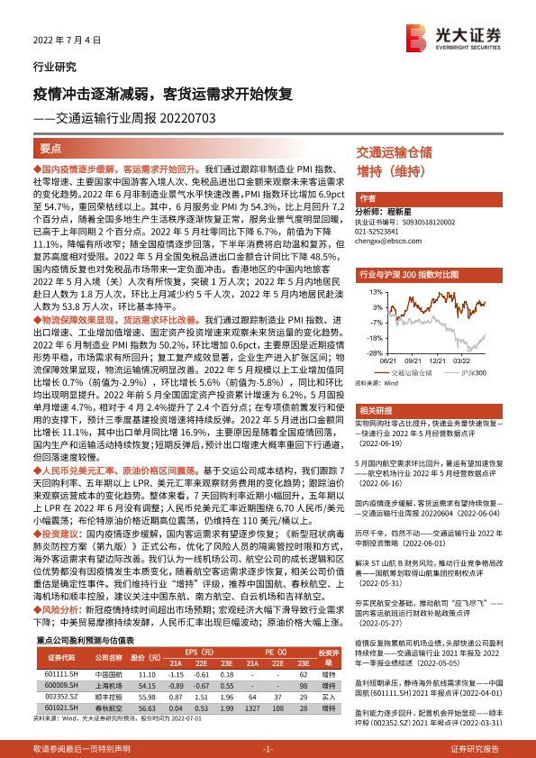 【光大证券】【20220704】交通运输行业周报:疫情冲击逐渐减弱,客货运需求开始恢复-9页