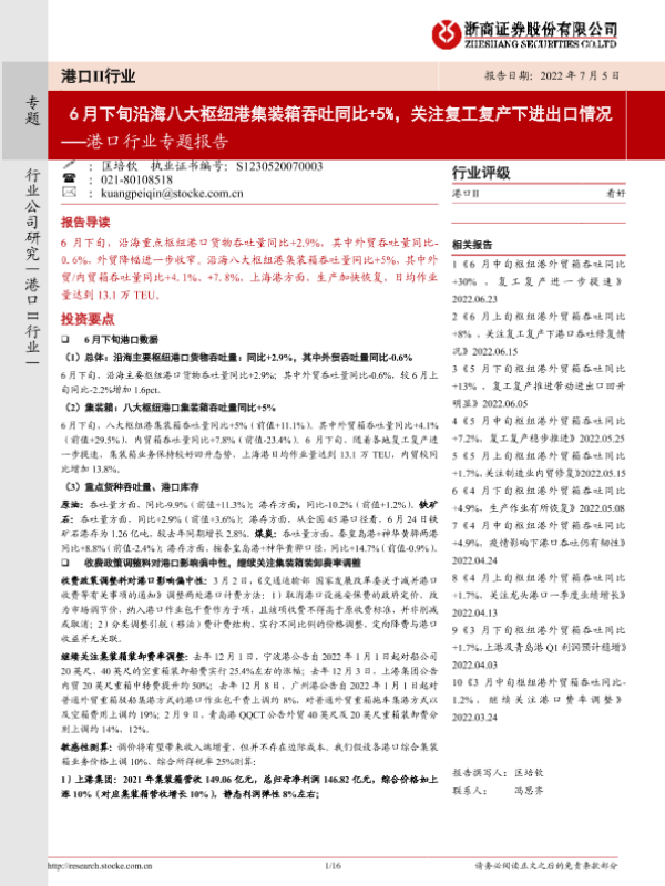 【浙商证券】【20220705】6月下旬沿海八大枢纽港集装箱吞吐同比+5%,关注复工复产下进出口情况-16页
