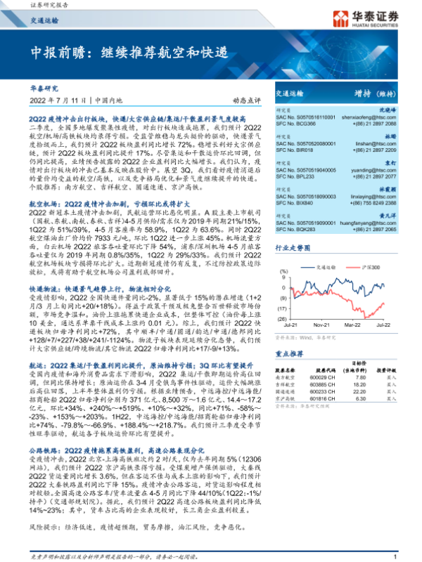 【华泰证券】【20220711】中报前瞻:继续推荐航空和快递-7页