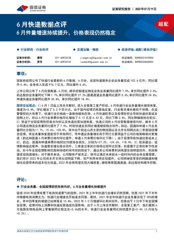 【国信证券】【20220719】6月快递数据点评:6月件量增速持续提升,价格表现仍然稳定-6页