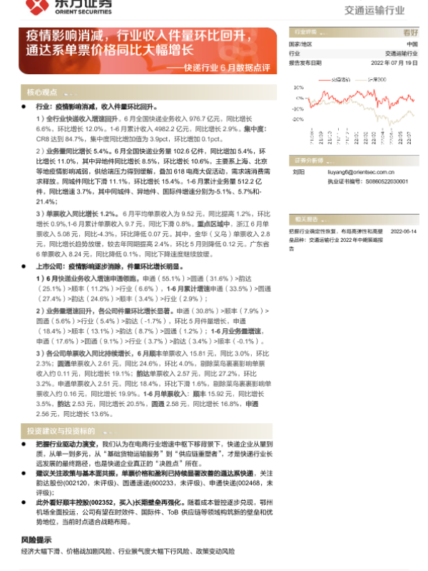 【东方证券】【20220719】疫情影响消减,行业收入件量环比回升,通达系单票价格同比大幅增长-7页