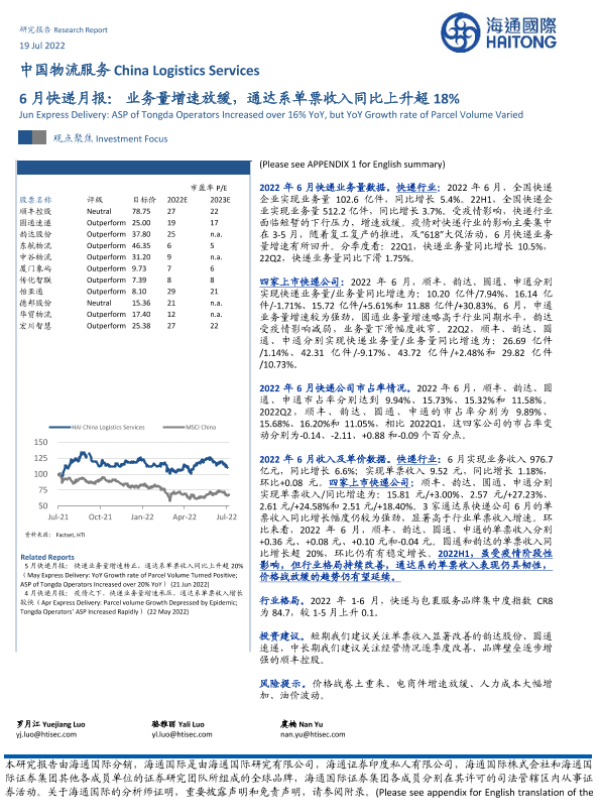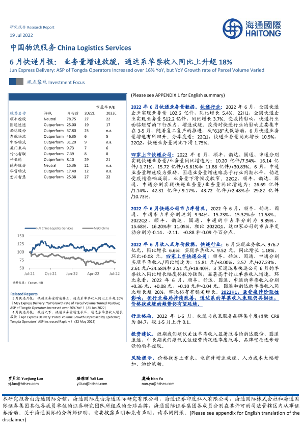 【海通国际】【20220719】6月快递月报:业务量增速放缓,通达系单票收入同比上升超18%-17页