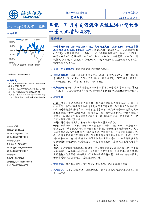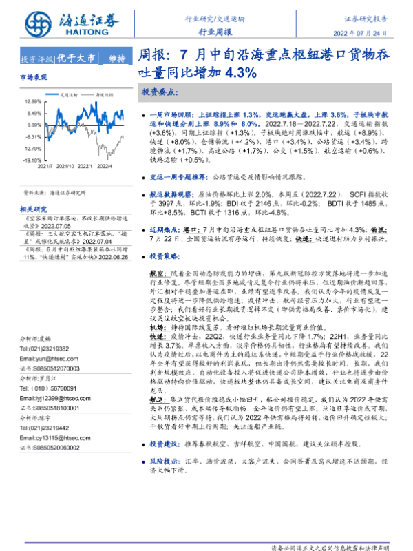 【海通证券】【20220724】7月中旬沿海重点枢纽港口货物吞吐量同比增加4.3%-11页