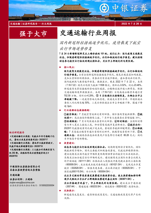 【中银证券】【20220726】国内新冠防控措施逐步优化,疫情散发下航空出行市场逆势修复-24页
