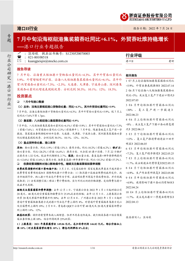 【浙商证券】【20220724】7月中旬沿海枢纽港集装箱吞吐同比+6.1%,外贸吞吐维持稳增长-16页