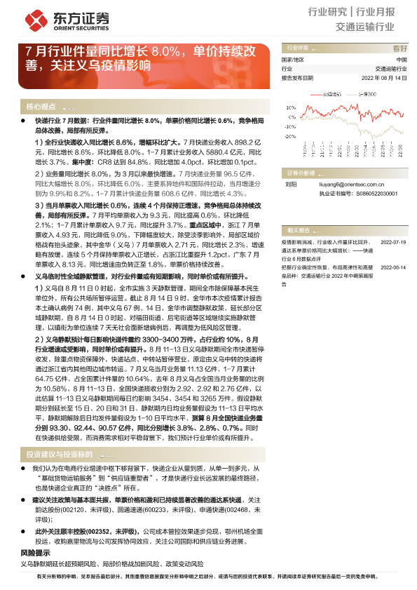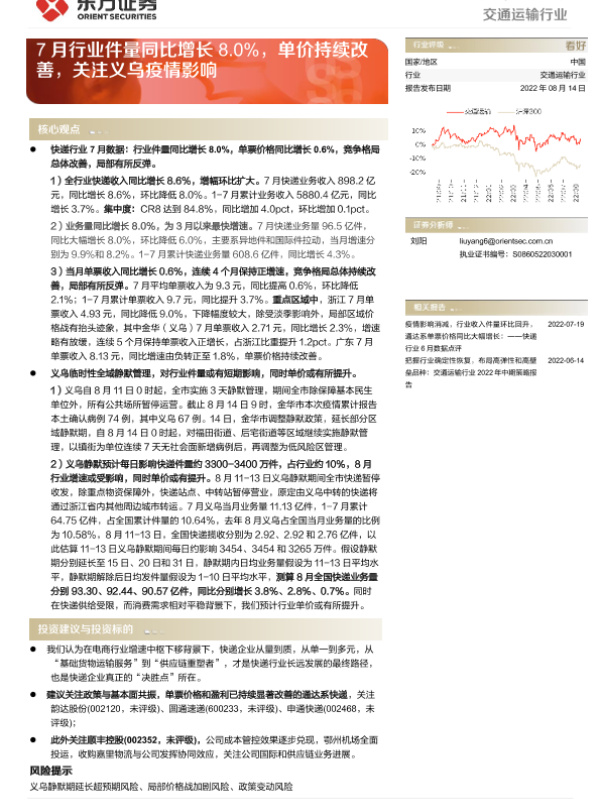 【东方证券】【20220814】交通运输行业行业月报:7月行业件量同比增长8.0%,单价持续改善,关注义乌疫情影响-5页