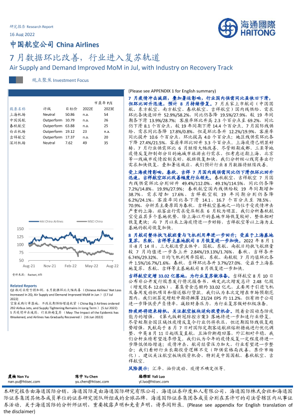 【海通国际】【20220816】中国航空公司:7月数据环比改善,行业进入复苏轨道-11页