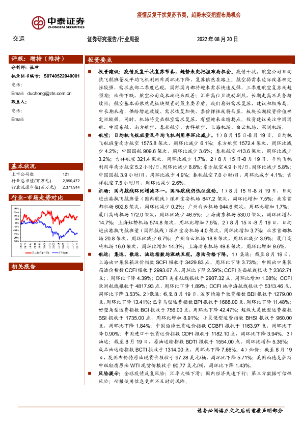 【中泰证券】【20220820】交运行业周报:疫情反复干扰复苏节奏,趋势未变把握布局机会-32页