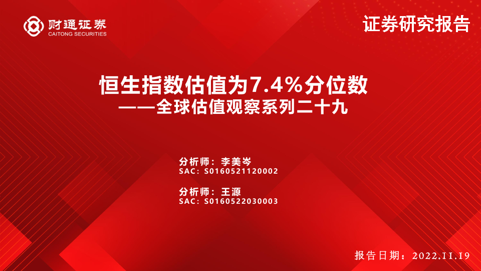 【财通证券】【20221119】全球估值观察系列二十九:恒生指数估值为7.4%分位数-29页
