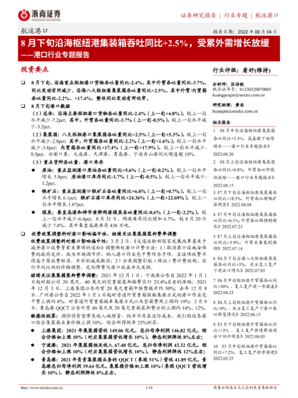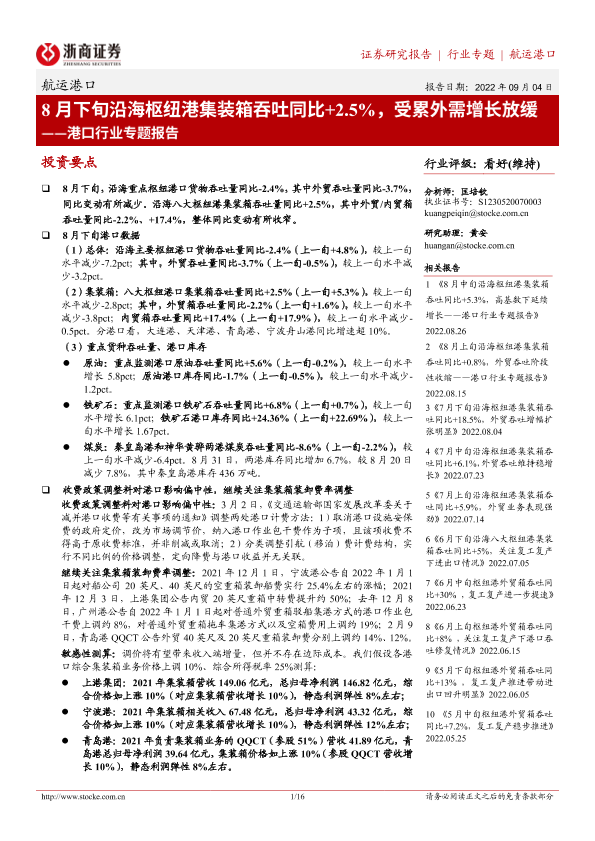 【浙商证券】【20220904】8月下旬沿海枢纽港集装箱吞吐同比+2.5%,受累外需增长放缓-16页