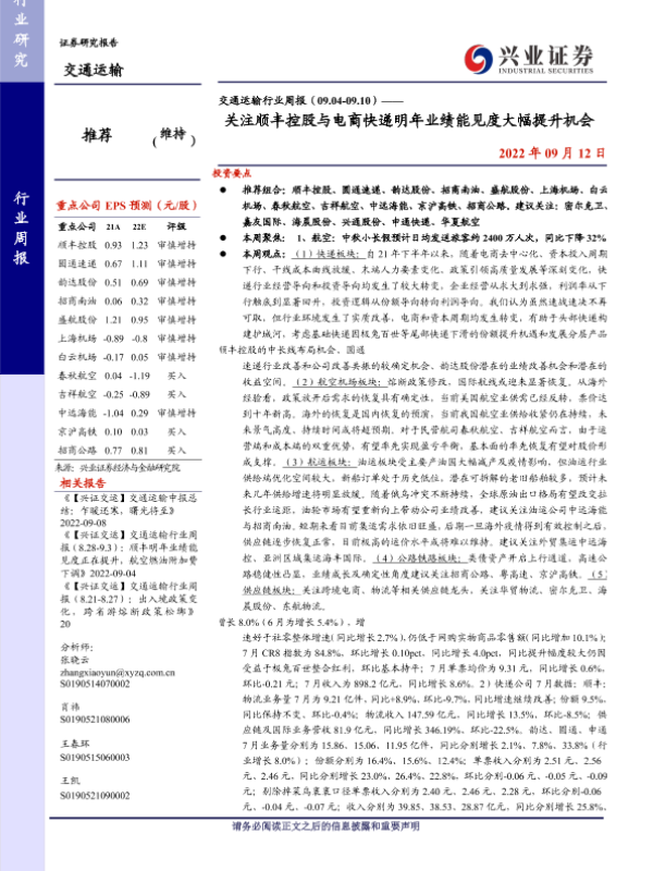 【兴业证券】【20220912】交通运输行业周报:关注顺丰控股与电商快递明年业绩能见度大幅提升机会-24页