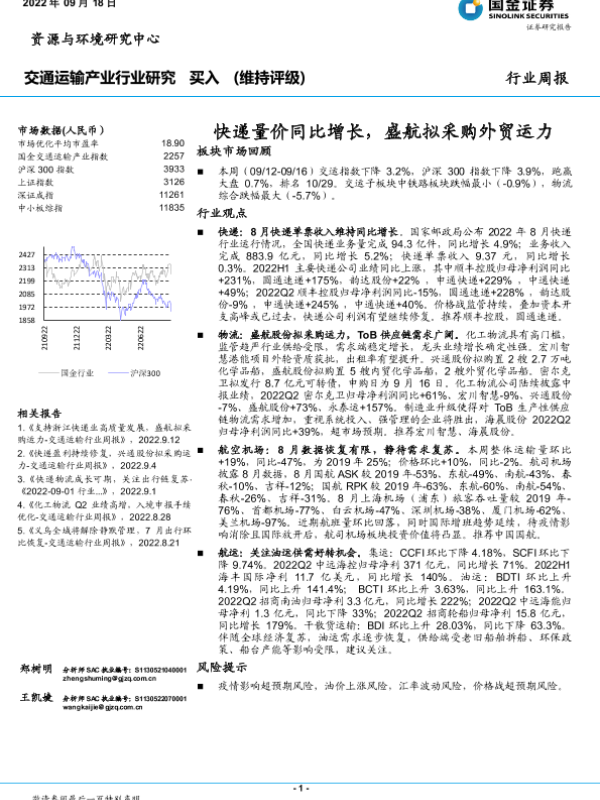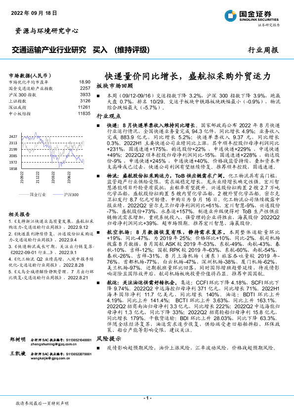 【国金证券】【20220918】交通运输产业行业研究:快递量价同比增长,盛航拟采购外贸运力-15页
