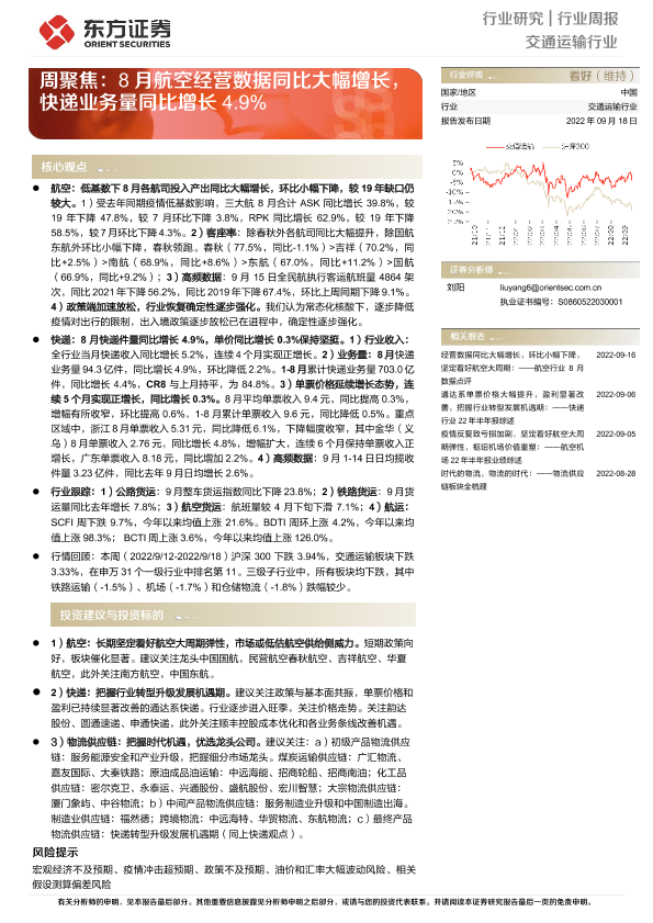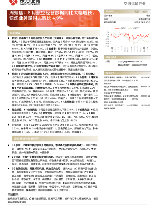【东方证券】【20220918】交通运输行业周聚焦:8月航空经营数据同比大幅增长,快递业务量同比增长4.9%-18页
