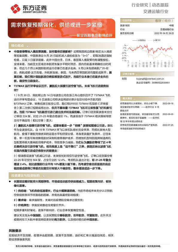 【东方证券】【20220928】交通运输行业:航空近期事件影响点评-15页