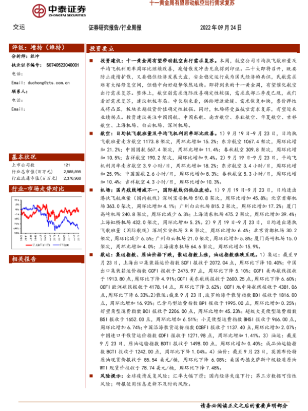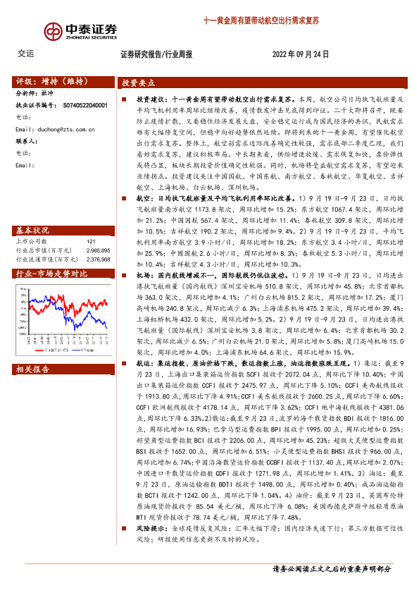 【中泰证券】【20220924】交运行业周报:十一黄金周有望带动航空出行需求复苏-34页