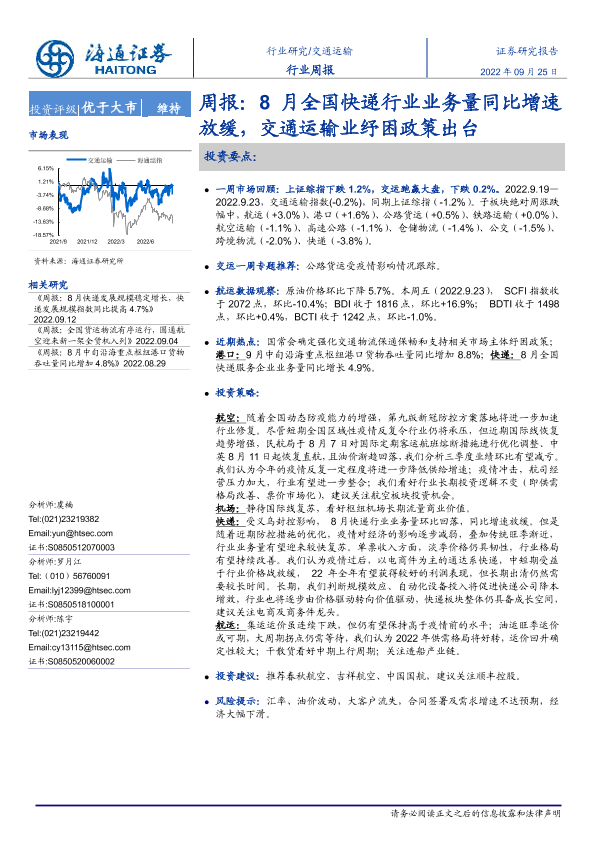 【海通证券】【20220925】物流行业周报:8月全国快递行业业务量同比增速放缓,交通运输业纾困政策出台-11页