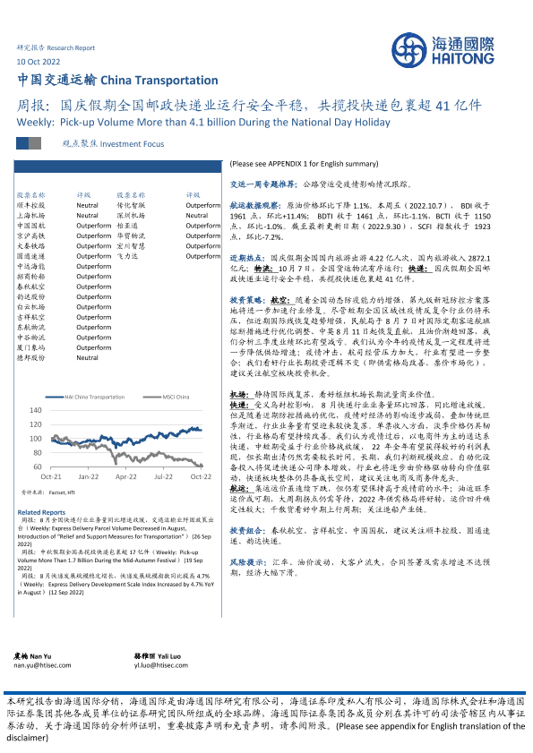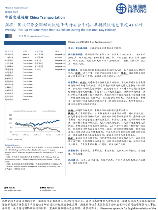 【海通国际】【20221010】中国交通运输周报:国庆假期全国邮政快递业运行安全平稳-14页