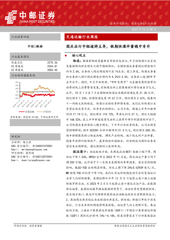 【中邮证券】【20221008】交通运输行业周报:国庆出行中短途游主导,假期快递件量稳中有升-29页