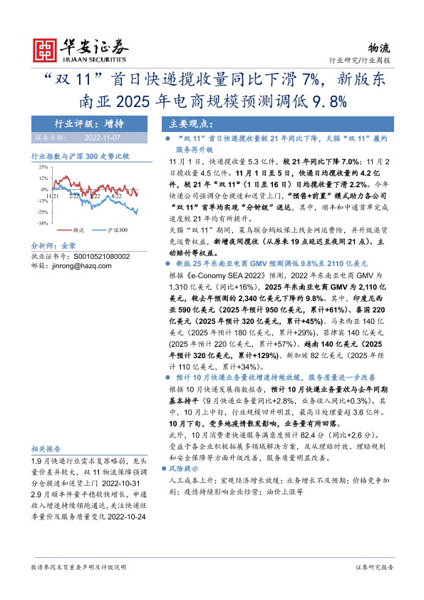 【华安证券】【20221107】物流行业周报:“双11”首日快递揽收量同比下滑7%,新版东南亚2025年电商规模预测调低9.8%-10页