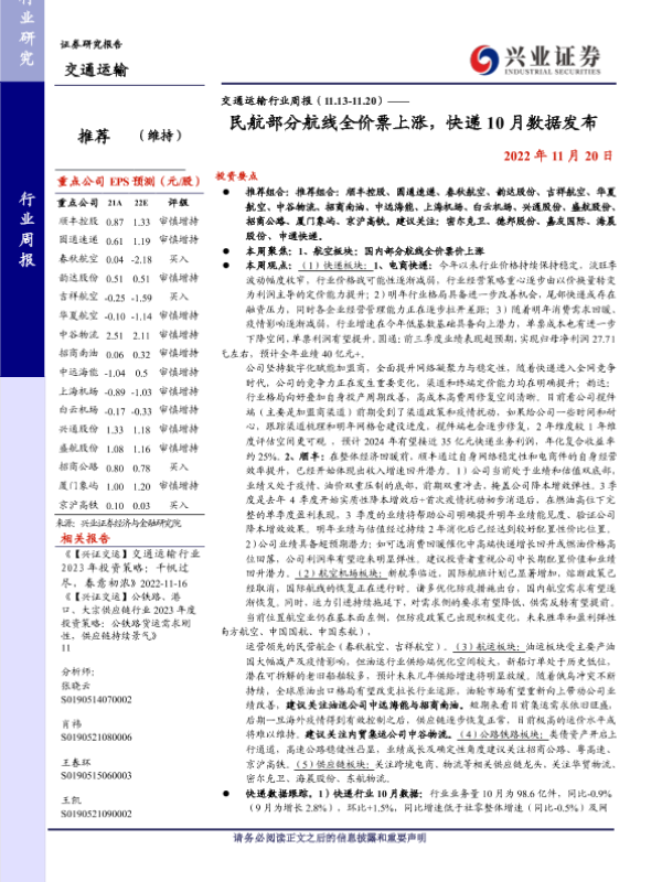 【兴业证券】【20221120】交通运输行业周报:民航部分航线全价票上涨,快递10月数据发布-27页