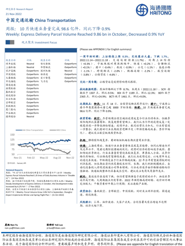 【海通国际】【20221121】中国交通运输周报:10月快递业务量完成98.6亿件,同比下降0.9%-15页