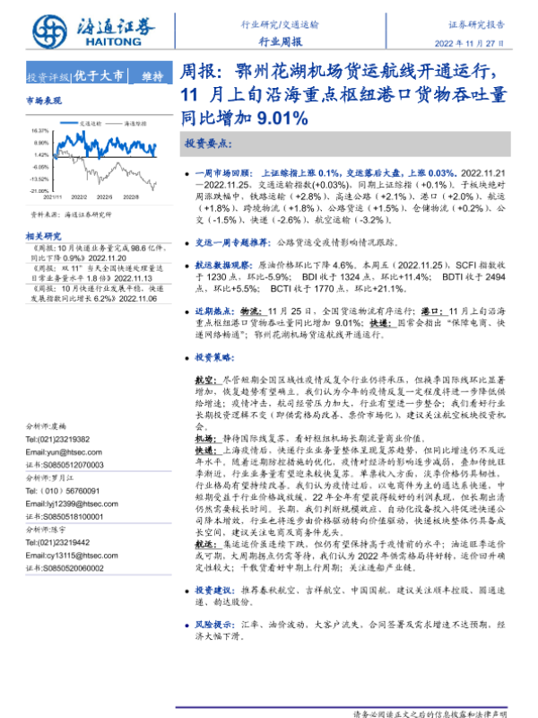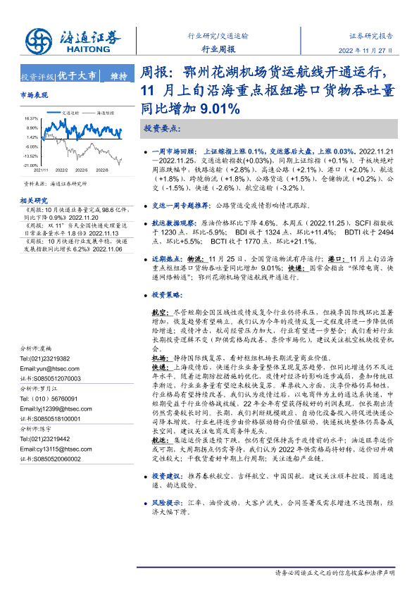 【海通证券】【20221127】鄂州花湖机场货运航线开通运行,11月上旬沿海重点枢纽港口货物吞吐量同比增加9.01%-11页