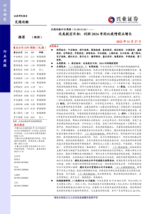 【兴业证券】【20221127】交通运输行业周报:达美航空目标:利润2024年同比疫情前正增长-27页