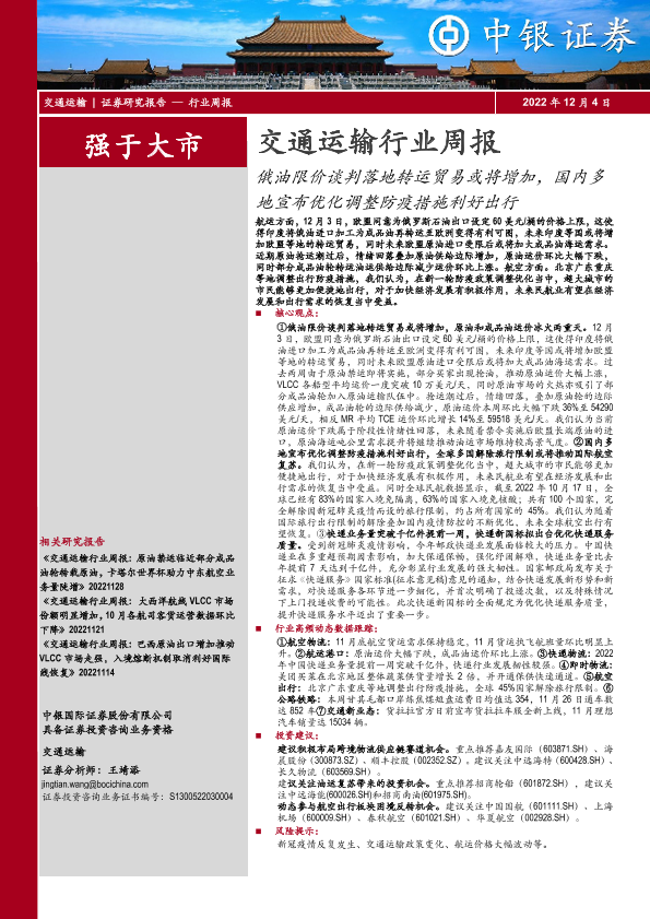 【中银证券】【20221204】俄油限价谈判落地转运贸易或将增加,国内多地宣布优化调整防疫措施利好出行-30页