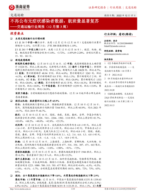 【浙商证券】【20221217】交通运输行业周报:不再公布无症状感染者数据,航班量显著复苏-19页