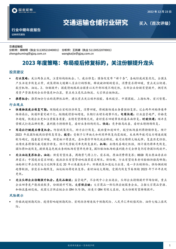 【国金证券】【20221223】交通运输仓储行业研究:2023年度策略:布局疫后修复标的,关注份额提升龙头-37页