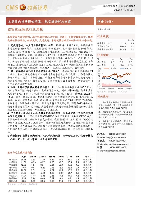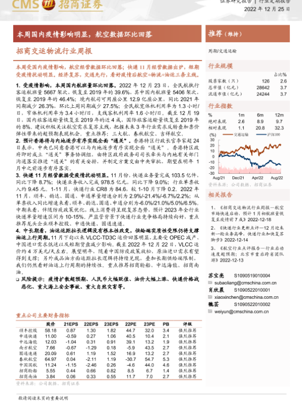 【海通证券】【20221225】招商交运物流行业周报:本周国内疫情影响明显,航空数据环比回落-17页