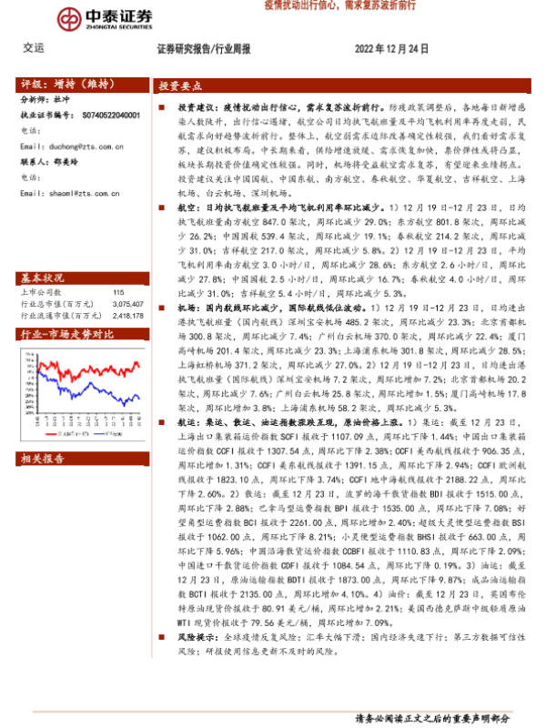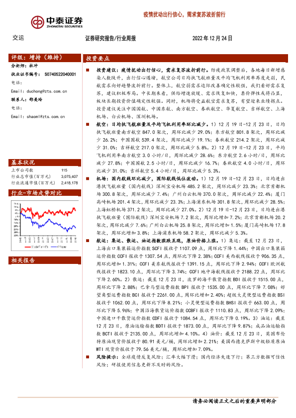 【中泰证券】【20221224】交运行业周报:疫情扰动出行信心,需求复苏波折前行-36页