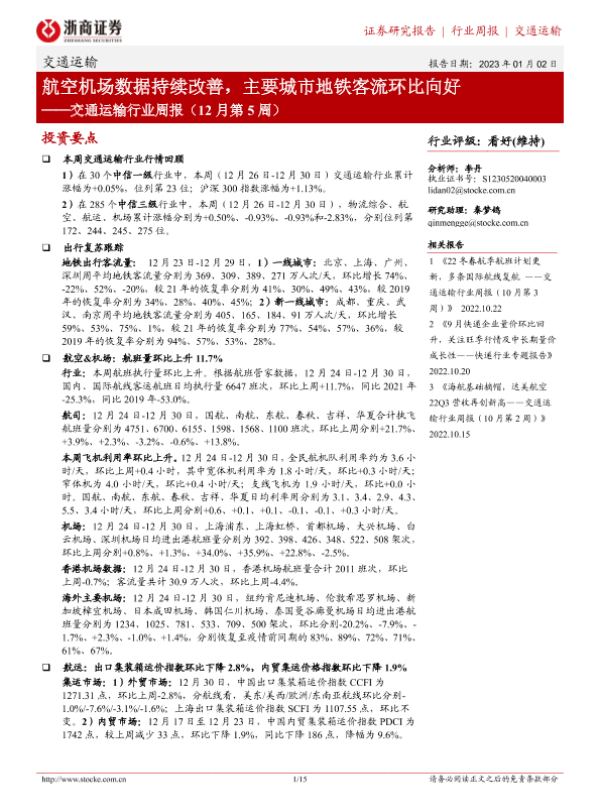 【浙商证券】【20230102】航空机场数据持续改善,主要城市地铁客流环比向好-15页