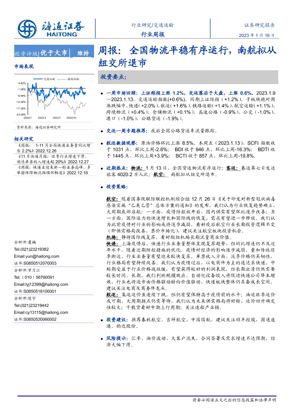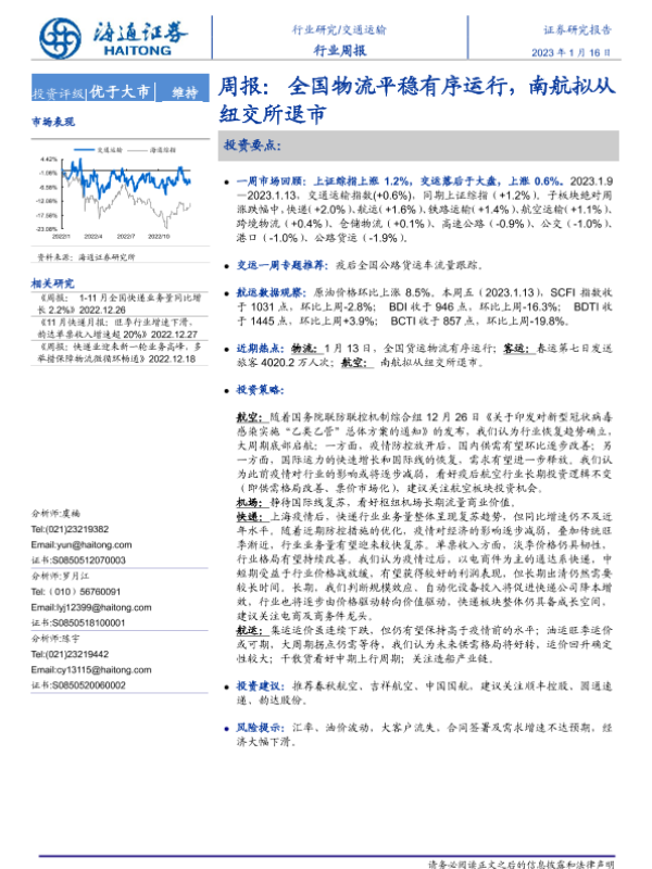 【海通证券】【20230116】全国物流平稳有序运行,南航拟从纽交所退市-10页