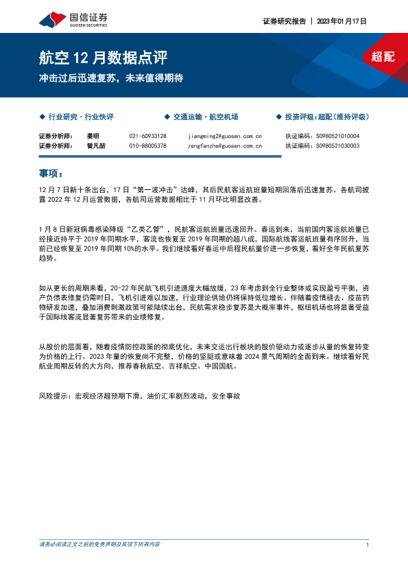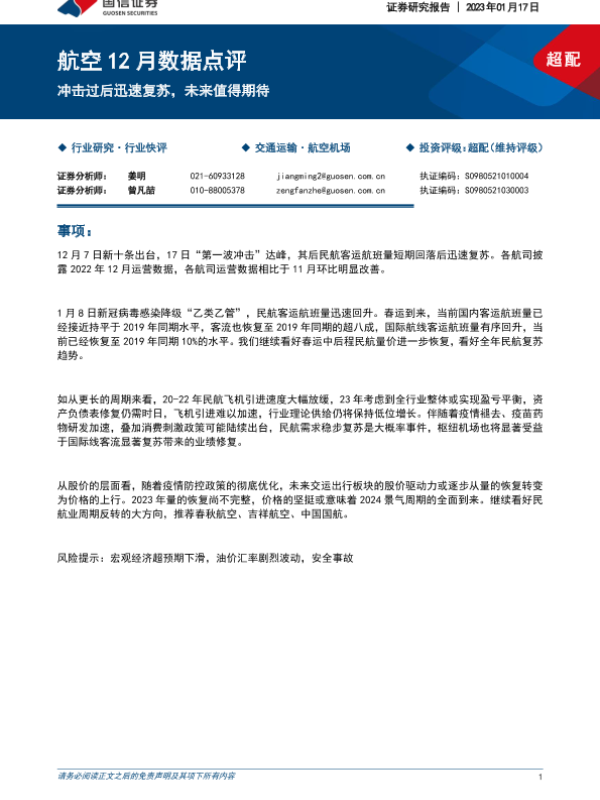 【国信证券】【20230117】航空12月数据点评:冲击过后迅速复苏,未来值得期待-12页