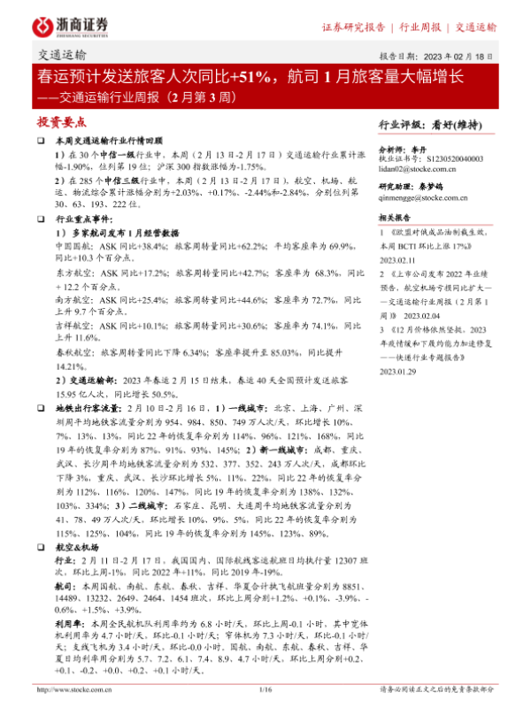 【浙商证券】【20230218】交通运输行业周报:春运预计发送旅客人次同比+51%,航司1月旅客量大幅增长-16页
