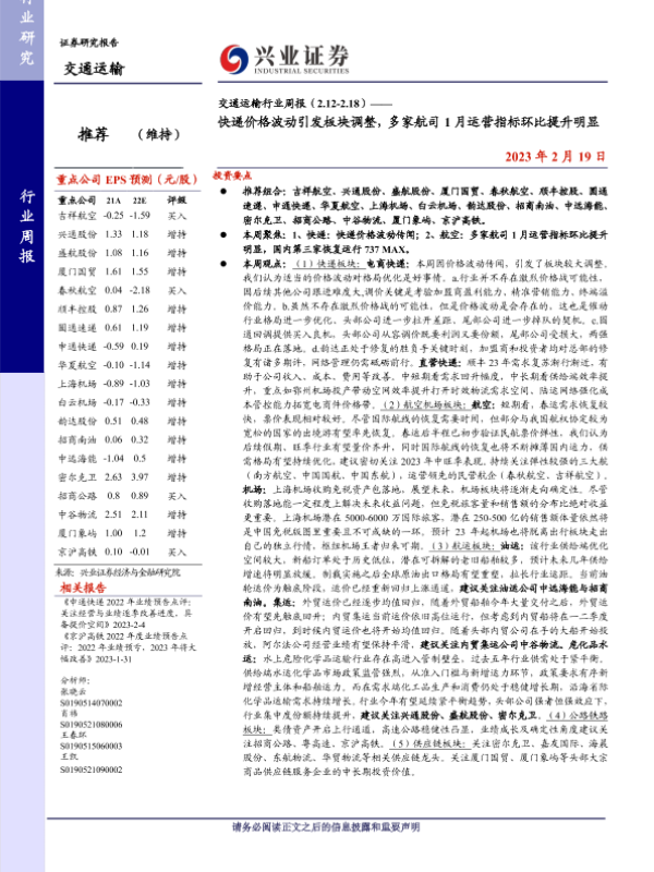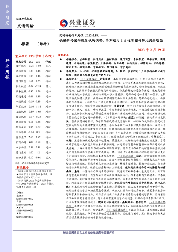 【兴业证券】【20230219】交通运输行业周报:快递价格波动引发板块调整,多家航司1月运营指标环比提升明显-21页