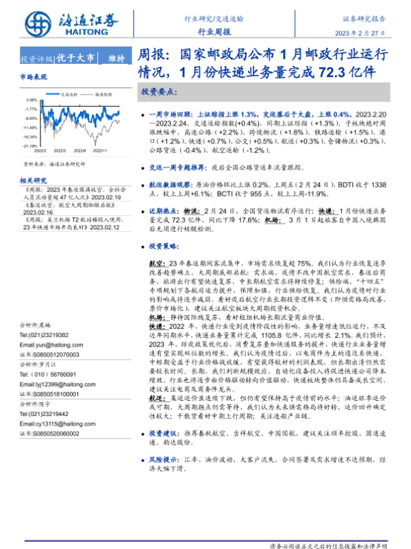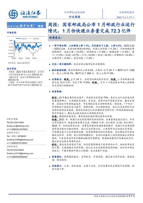 交通运输 市场表现 快递业务 投资策略 邮政行业