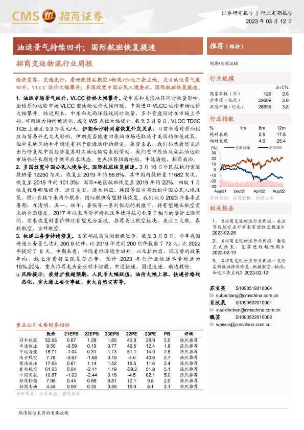 【海通证券】【20230312】招商交运物流行业周报:油运景气持续回升;国际航班恢复提速-17页