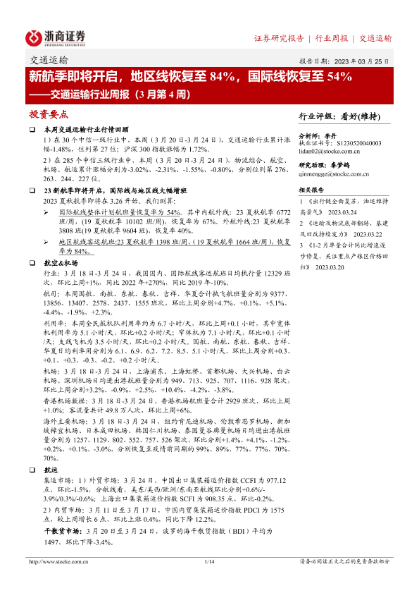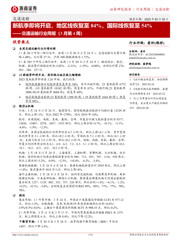 【浙商证券】【20230325】新航季即将开启,地区线恢复至84%,国际线恢复至54%-14页