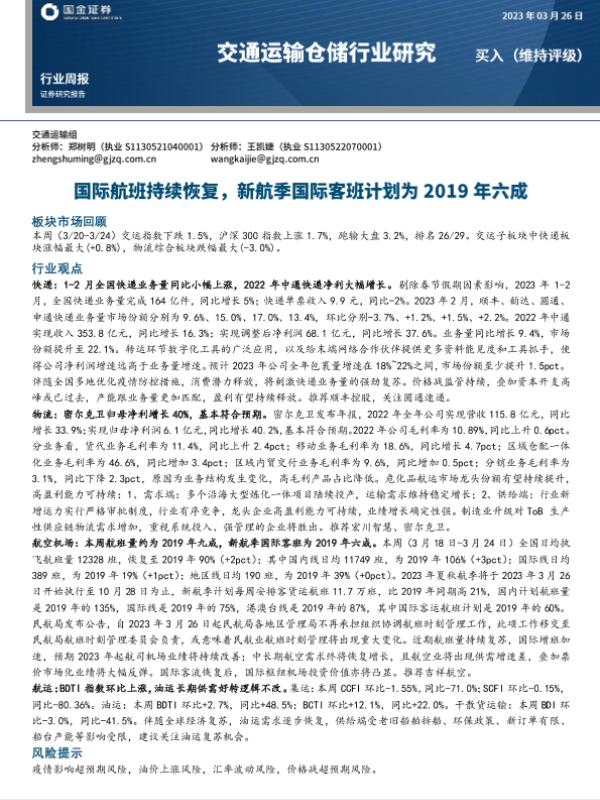 【国金证券】【20230326】交通运输仓储行业周报:国际航班持续恢复,新航季国际客班计划为2019年六成-14页