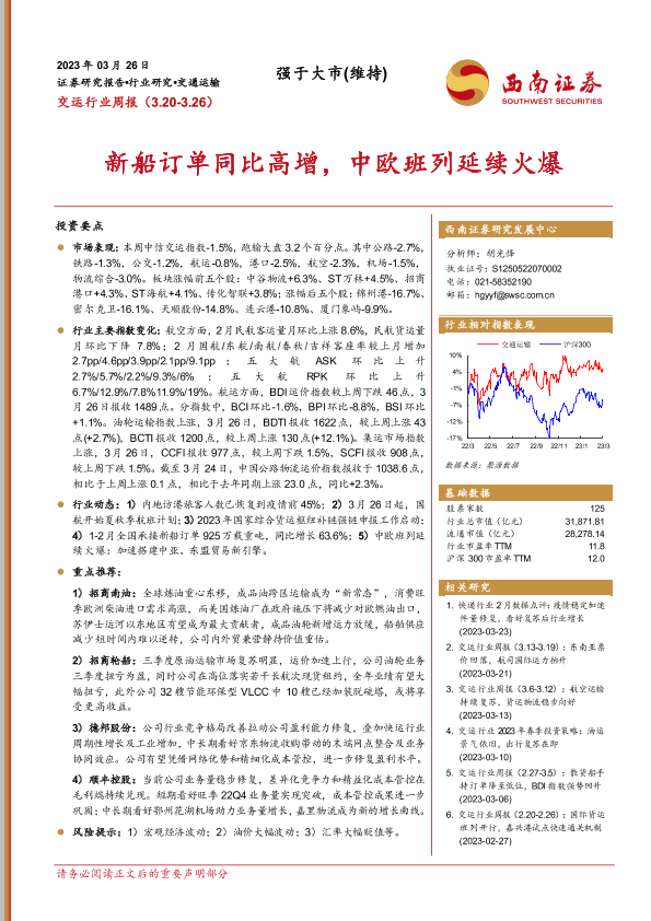【西南证券】【20230326】交运行业周报:新船订单同比高增,中欧班列延续火爆-21页