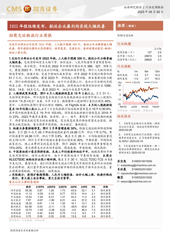 【海通证券】【20230402】交运物流行业周报:2022年报陆续发布,航运企业盈利均实现大幅改善-16页