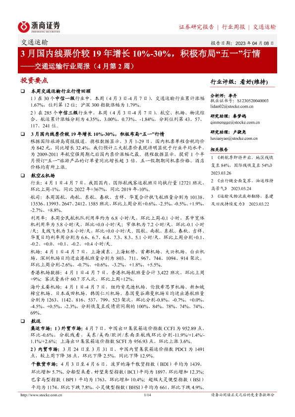 【浙商证券】【20230408】3月国内线票价较19年增长10%-30%,积极布局“五一”行情-14页