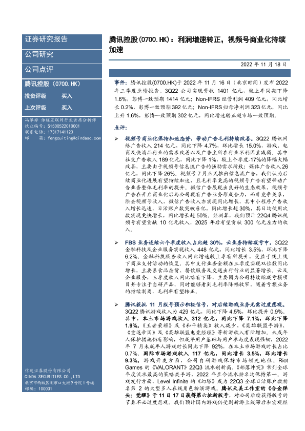 【信达证券】【20221118】腾讯控股(0700.HK):利润增速转正,视频号商业化持续加速-18页