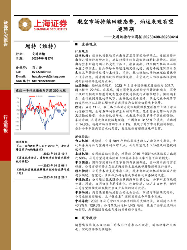 【上海证券】【20230417】交通运输行业周报:航空市场持续回暖态势,油运表现有望超预期-10页
