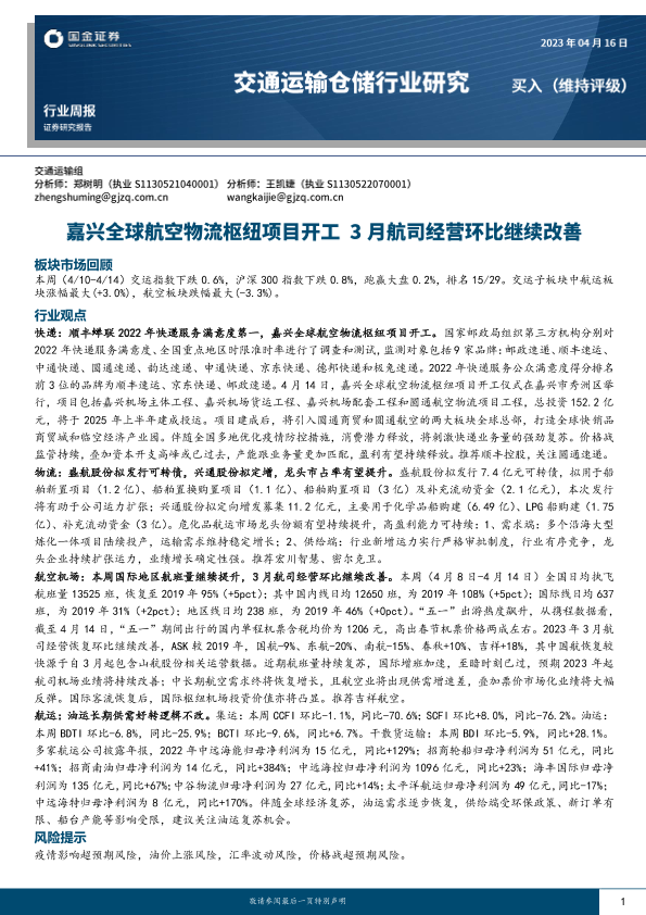 【国金证券】【20230416】交通运输仓储行业周报:嘉兴全球航空物流枢纽项目开工 3月航司经营环比继续改善-14页